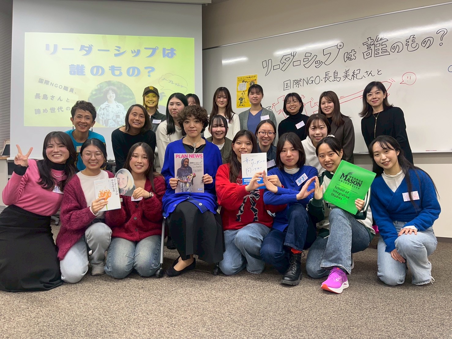 長島さん企画にて。企画メンバーは、中央の椅子に座った長島さんに並び一列目に勢ぞろい。米国ジョージ・メイソン大学でリーダーシップ開発教育に携わる山中葵先生(後列左から2人目)も一緒に!