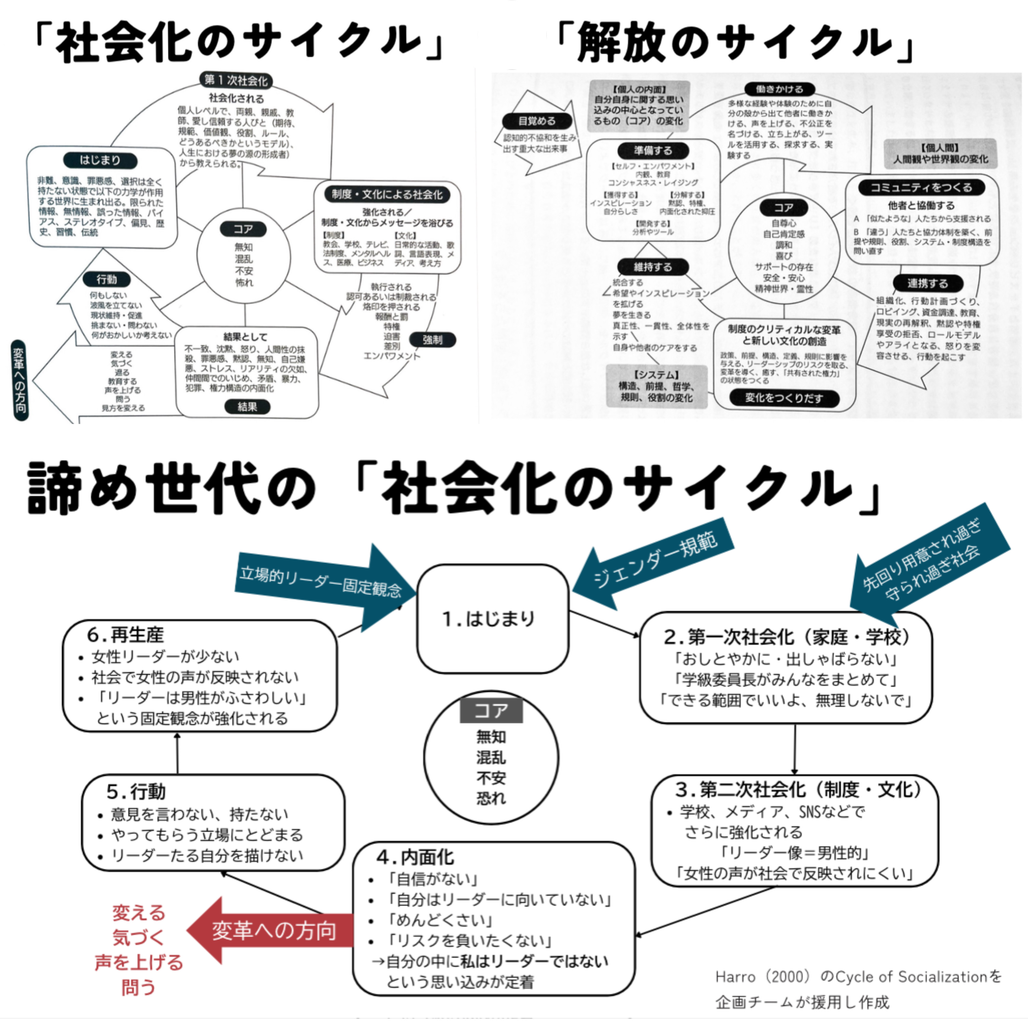 上段はHarroの「社会化のサイクル」と「解放のサイクル」、下段は企画チームがHarroの「社会化のサイクル」を援用して作成したオリジナルの社会化のサイクル。