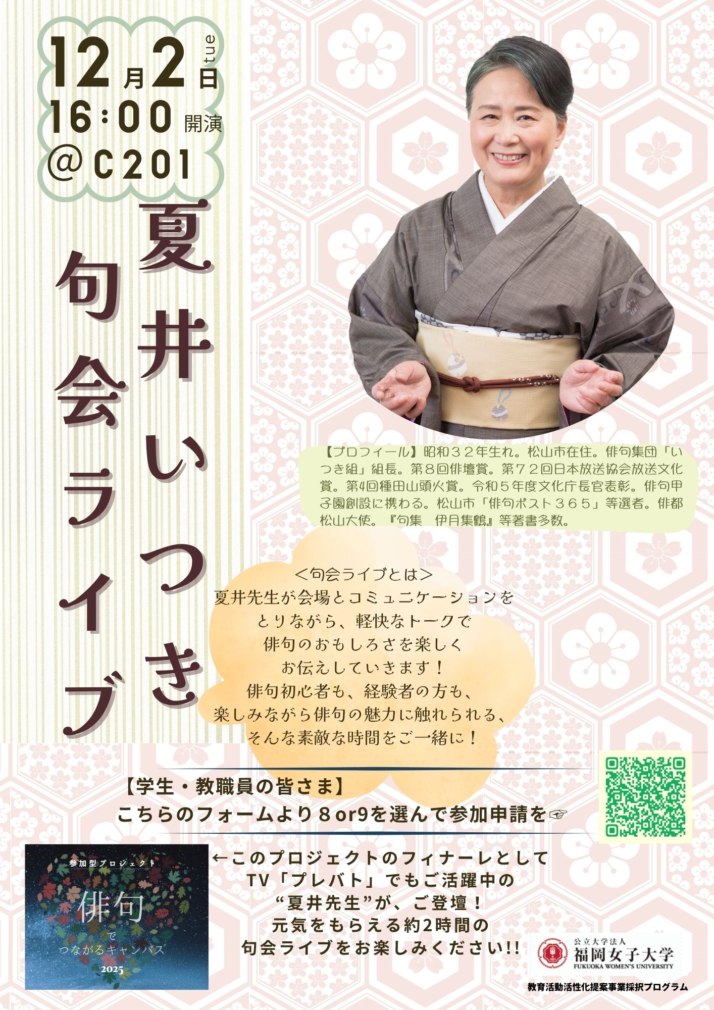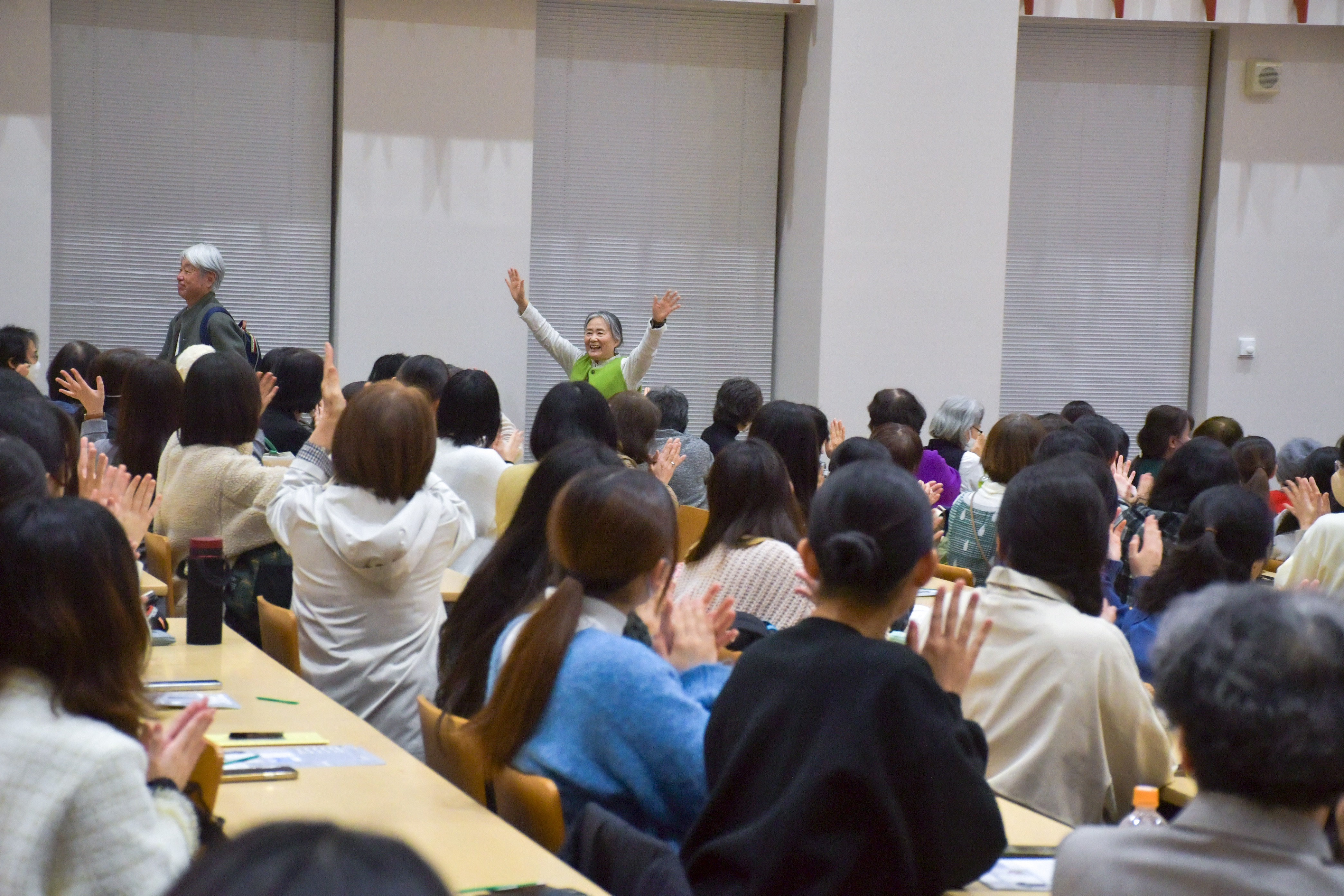 閉会時に、参加者から募った感想には、俳句への気づきや夏井先生へのお礼、熱い再登壇リクエスト、「会場の一体感が楽しかった」といった感動の言葉などが溢れ、全てがポジティブな内容で、その数は、任意提出にもかかわらず90を超えていました。また、地域の方や同窓会の方に、現在の福女大、そして学生の様子を直接見ていただく機会にもなったようで、学生の佇まいや運営学生たちの活躍ぶりを讃える感想も含まれていて、いずれの感想もたいへん喜ばしいものでした。