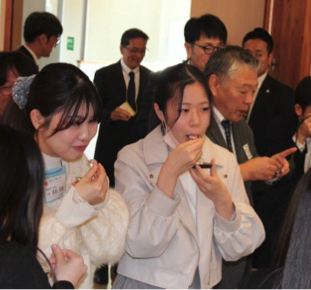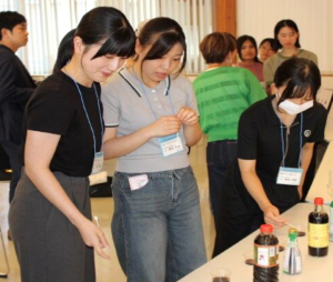 福岡県内の栄養系の大学・デザインの専門学校の学生と福岡県醤油醸造協同組合の方が交流し、減塩醤油に関する意見交流を行いました。組合の方があらかじめ作ってくださった減塩醤油の試作品を実際に試食をして、味についての感想を述べ、福岡県ならではの味の減塩醤油の開発に携わりました。他大学の学生と関わったり、外部で意見を発表したりする機会はなかなかなかったので、非常に良い経験となりました。意見交流をする中で人それぞれ違う感性があることを実感するとともに、それを伝え合うことでより高め合うことができると感じました。