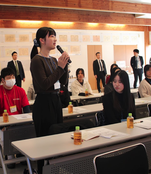 本学をはじめ、6つの大学・専門学校から約30名の学生が参加したほか、福岡県の服部知事にもご参加いただきました。当日は、第1回イベントでの意見交換をもとに作成された、福岡醤油醸造協同組合による「甘口」「切れ味」「バランス」の3タイプの試作品について説明および試食が行われました。あわせて、福岡デザイン専門学校の学生による複数のデザイン案のコンセプト説明も実施されました。これらを踏まえ、参加者全員による投票を通じて商品選抜を行い、「バランス」が採用されました。