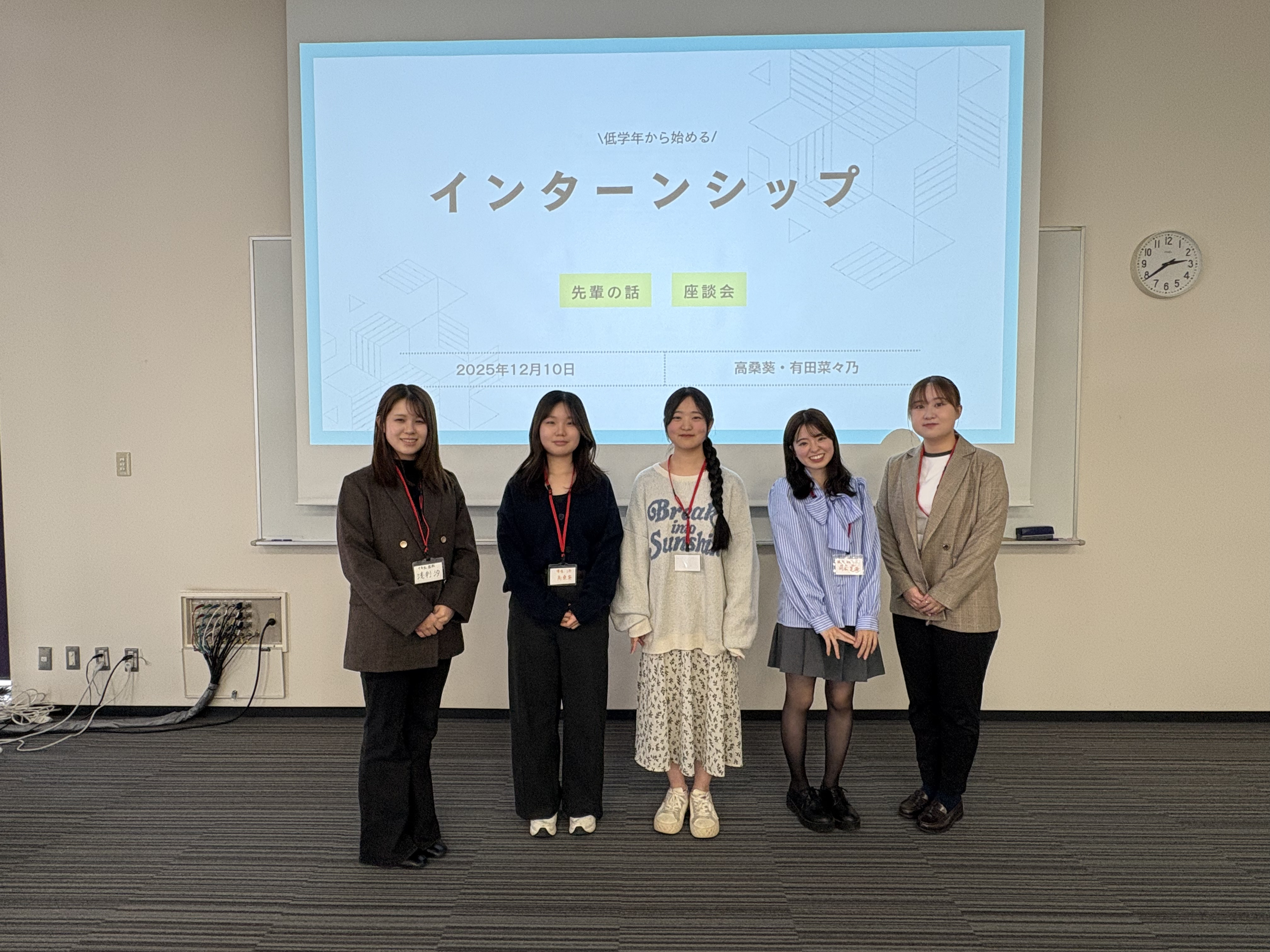 私たちは就活に関する情報を発信・共有することで就活を身近に感じ、学生時代に行いたいことを明確にしたり、自分の足りないところや強みなどを発見したりしてもらうということを目的に、「後悔しない就活のために!」というテーマで2つの企画を開催することにした。1つ目は「マイナビ講座」、2つ目は「先輩方との座談会」である。マイナビ講座には、株式会社マイナビの講師にお越しいただき、就活の流れ、企業が求める人材、学生のうちにやっておくべきことなど就活の基礎に関することを詳しく教えていただいた。先輩方との座談会には、内定が決まっている3名の先輩方にお越しいただき、トークセッション形式で、就職先の決め方や就活のためにしておいてよかったこと、苦労や後悔したこと、それを踏まえてのアドバイスなどについてお話ししていただいた。準備として、私たち学生委員はマイナビ講座チームと先輩方との座談会チームの2つのグループに分かれ、講師への依頼や学生への告知、当日の流れや動きを決めリハーサルなどを慎重に行った。質疑応答では想像以上にたくさんの参加学生からの質問があがり、皆がやはり就活に関して恐怖や不安な思いを抱いていると感じると同時に、特に知りたい観点は何かということも分析することができ新たな発見になった。
